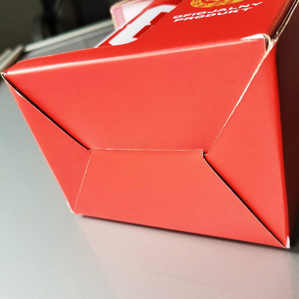 Pudełko zostało wykonane z tektury falistej typu E (mikrofala) o grubości około 1,5 mm. Na falę została skaszerowana okleina z nadrukiem offsetowym.