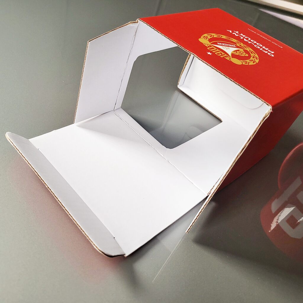 Okno w przedniej ściance pozostawiono bez folii, dzięki czemu kubek jest w pełni widoczny. W środku zastosowano kartonową wkładkę, która stabilizuje produkt i zabezpiecza go przed przemieszczaniem się w opakowaniu.